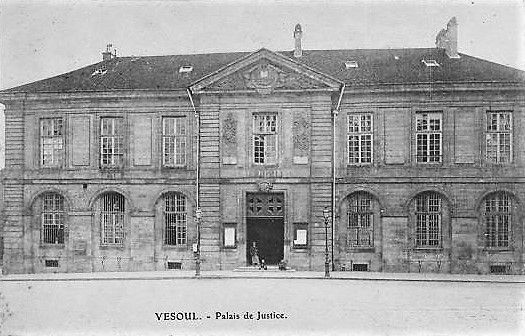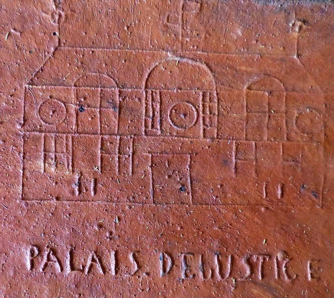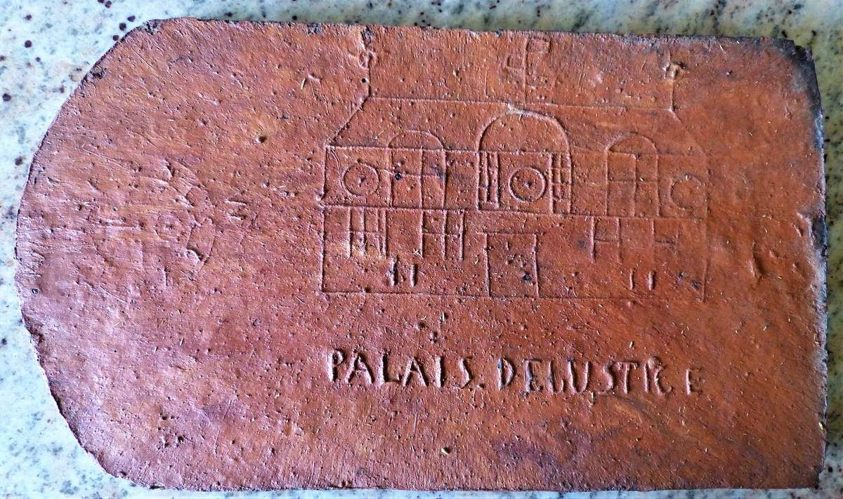 Les tuiles provenant de chantiers de démolition en Haute Saône, on peut penser qu'il s'agit d'une reproduction du palais de justice de Vesoul, bien que l'original ne ressemble pas tout à fait à la copie! La forme des fenêtres de l'étage et de celles du rez de chaussée est inversée... le souvenir du mouleur qui ne devait pas aller souvent à la ville, n'était sans doute pas très précis!