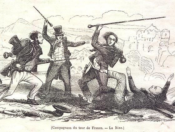 La canne était un symbole de l'appartenance du compagnon à une confrérie, elle permettait de porter le balluchon sur l'épaule, mais c'était aussi une arme de défense lors des rixes entre les "dévorants" qui appartenaient soit au"Devoir de liberté" soit au "Saint Devoir de Dieu":