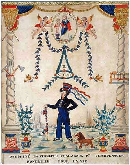 Les attributs du personnage: chapeau, pipe, écharpes et canne font penser aux compagnons du devoir.